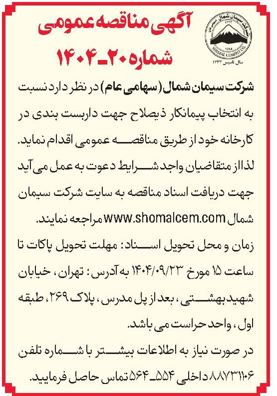 شرکت سیمان شمال در نظر دارد نسبت به انتخاب پیمانکار ذیصلاح جهت اجرای عملیات عمرانی تونل بتنی باند انتقال کلینکر بای پس به انبار کلینکر قدیم کارخانه خود اقدام نماید. لذا از متقاضیان محترم دعوت بعمل می آید جهت دریافت اسناد مناقصه و تحویل پاکات پیشنهادات حداکثر تا تاریخ ۱۴۰۳/۰۷/۰۵ به آدرس تهران- خیابان شهید بهشتی- بعد از پل مدرس- پلاک ۲۶۹- طبقه اول- واحد بازرگانی(امور قراردادها) مراجعه نمایند و یا در صورت نیاز به اطلاعات بیشتر با شماره تلفن ۸۸۷۳۱۱۰۶ داخلی ۵۵۴ تماس حاصل فرمایند.