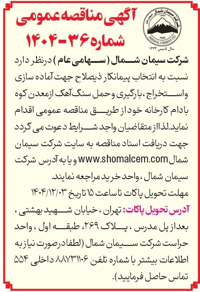 شرکت سیمان شمال در نظر دارد اقلام ضایعاتی و مستعمل کارخانه خود به شرح ذیل از طریق مزایده عمومی به فروش برساند. لذا متقاضیان می توانند جهت بازدید و کسب اطلاعات بیشتر و دریافت فرم شرکت در مزایده حداکثر ظرف مدت یک هفته از تاریخ درج آگهی به آدرس تهران – خیابان شهید بهشتی – بعد از پل مدرس – پلاک ۲۶۹ – طبقه اول – واحد بازرگانی( امور قرارداد ها)مراجعه نمایند و یا در صورت نیاز به اطلاعات بیشتر با شماره تلفن۸۸۷۳۷۴۸۹ داخلی ۵۵۲-۵۶۳ تماس حاصل فرمایند.